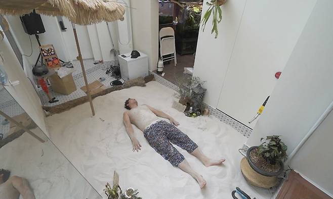 또한 그는 모래 위에 커다란 라탄 파라솔까지 설치해 해변 분위기를 끌어올린다.