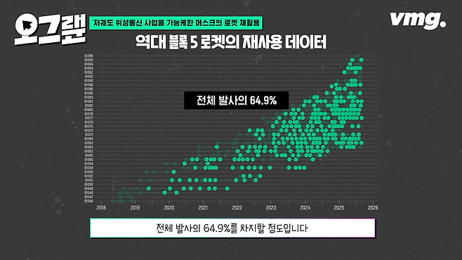 이 팰컨9이 우주 로켓 역사상 처음으로 재사용이라는 개념을 도입한 발사체입니다. 로켓을 재사용하면서 발사 비용이 현저히 떨어졌고 그러다 보니 관련 사업들이 폭발적으로 성장할 수 있게 된 거죠. 현재 스페이스X의 주력 재사용 로켓 모델은 팰컨9 블록5입니다. 이 블록5 로켓의 재사용 데이터를 가지고 그려봤습니다.