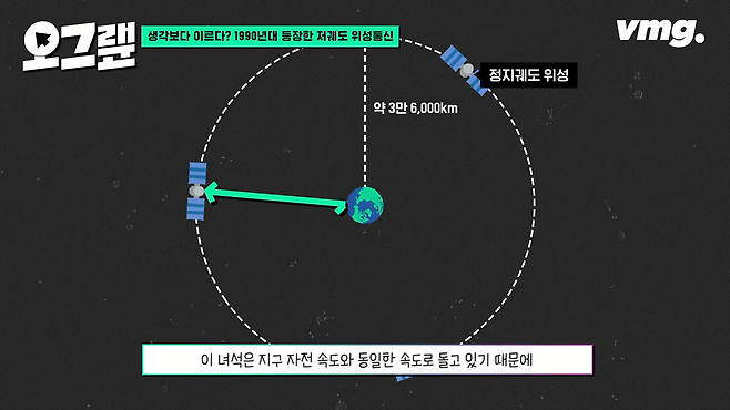 우선 지구 표면으로부터 약 3만 6,000km 떨어져 있는 이 위성은 정지궤도 위성입니다. 이 녀석은 지구 자전 속도와 동일한 속도로 돌고 있기 때문에 우리가 보기엔 마치 정지해 있는 듯하죠. 아주 높은 궤도에서 돌고 있어서 3개의 위성만으로도 지구 전역을 커버할 수 있습니다. 그래서 TV나 통신 서비스에 이용되고 있어요.