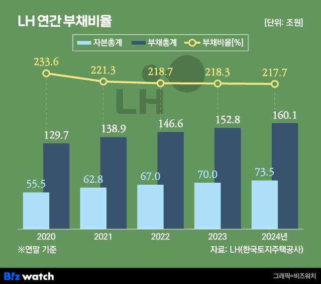 실제 공공기관 경영정보 공개시스템 알리오에 따르면 지난해 말 기준 LH 부채는 160조1055억원, 부채비율은 217.69%다. 차입금의존도는 41.68%로 전년 39.62%보다 2.06%포인트 확대되는 등 40%를 넘어섰다.
