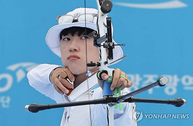 (광주=연합뉴스) 김성민 기자 = 12일 광주 동구 국립아시아문화전당 5·18민주광장에서 열린 2025 세계양궁선수권대회 리커브 여자 개인전 16강에서 안산이 화살을 쏘고 있다. 2025.9.12