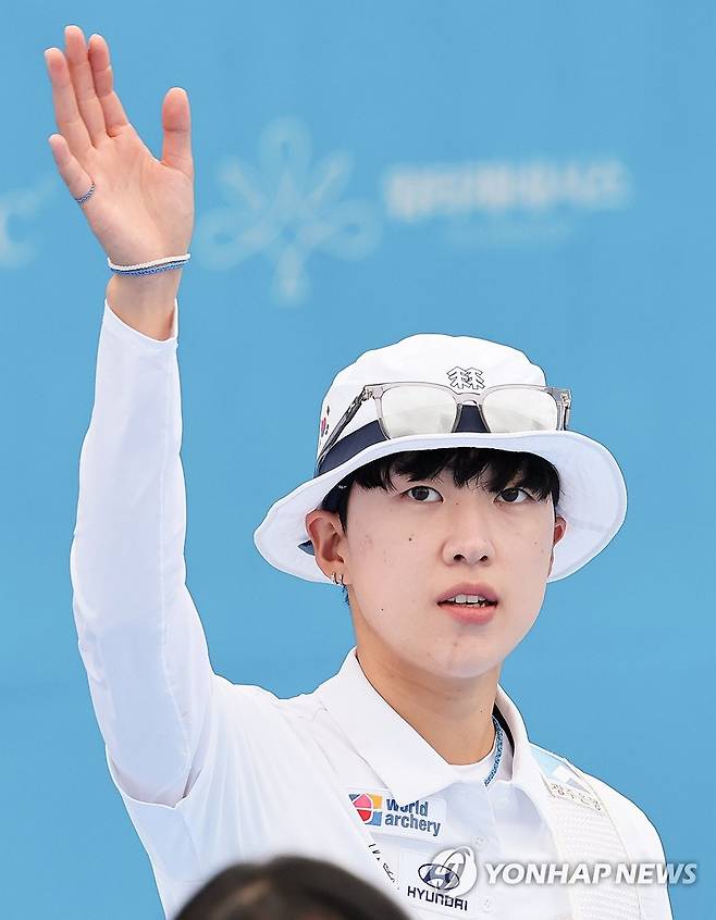 (광주=연합뉴스) 김성민 기자 = 12일 광주 동구 국립아시아문화전당 5·18민주광장에서 열린 2025 세계양궁선수권대회 리커브 여자 개인전 16강에서 승리한 안산이 손을 흔들고 있다. 2025.9.12