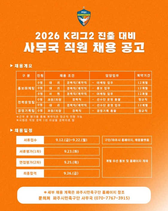 경기도 북부의 53만 대도시 파주시를 연고로 한 파주시민축구단은 오는 9월 12일(금)부터 오는 9월 22일(월)까지 홍보마케팅팀, 전력운영팀과 경영기획팀에 합류해 2026 K리그2 진출 준비를 함께할 인재에 대한 서류 접수를 시작으로 공개 채용을 실시한다.