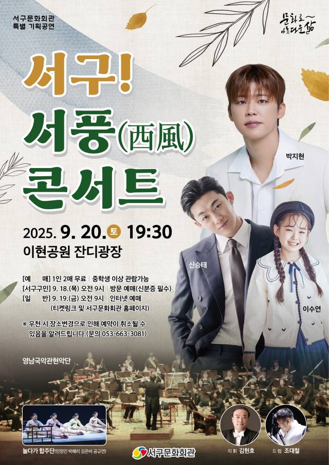 서구문화회관은 오는 20일(토) 오후 7시 30분 이현공원 잔디광장에서 가수 박지현, 신승태, 이수연을 초청해 서구 대표 브랜드 공연 '서구! 서풍(西風) 콘서트'를 개최한다.