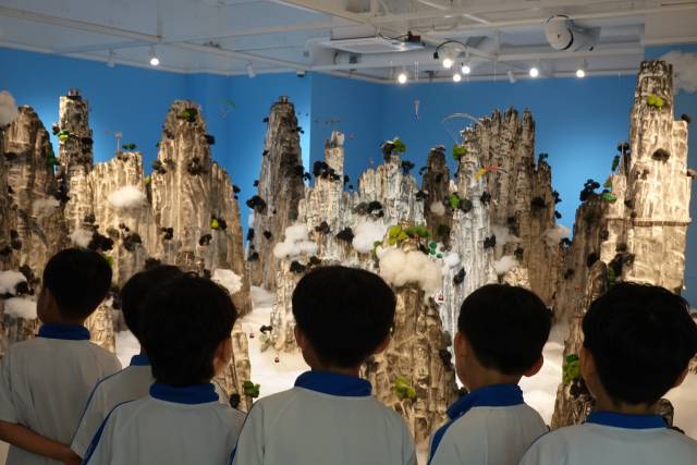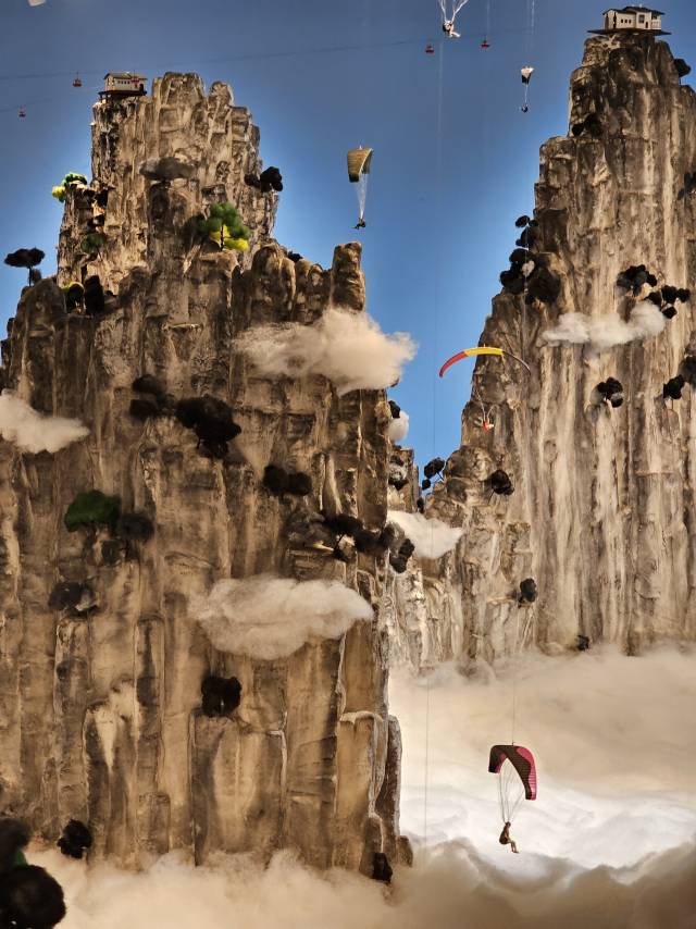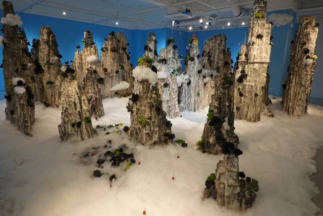 작가의 다른 작품인 ‘산수유람-패키지여행’에도 솜이 활용됐다. ‘소원을 말해봐’를 지나 전시장 안으로 이동하면 중국의 유명 관광지 장자제(張家界)를 연상시키는 대협곡 조형물이 보인다. 기둥 형상의 산과 바위, 하늘을 가로지르는 케이블카, 능선을 따라 날아오르는 비행기 모두 멋있지만, 솜으로 구현한 뭉게구름이 바로 동화 같은 풍경을 연출하는 핵심 요소다.