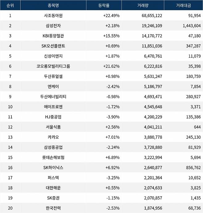 한편 거래량 상위 20위권 종목들은 HJ중공업(097230) ▼3.90%, 서울식품(004410) ▲2.56%, 카카오(035720) ▲7.01%, 삼성중공업(010140) ▼2.24%, 롯데손해보험(000400) ▲6.89%, SK하이닉스(000660) ▲6.92%, 퍼스텍(010820) ▼3.25%, 대한해운(005880) ▲0.55%, SK증권(001510) ▼1.15%, 한국전력(015760) ▼2.53% 등의 성적을 기록하고 있다.