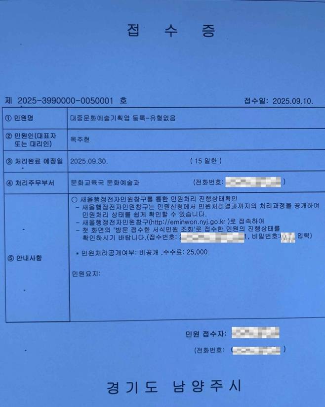 실수를 인지한 후 곧바로 보완절차를 밟아 2025년 9월 10일, 대중문화예술기획업 등 록신청을 마쳤고, 현재 등록을 기다리고 있는 상태입니다.