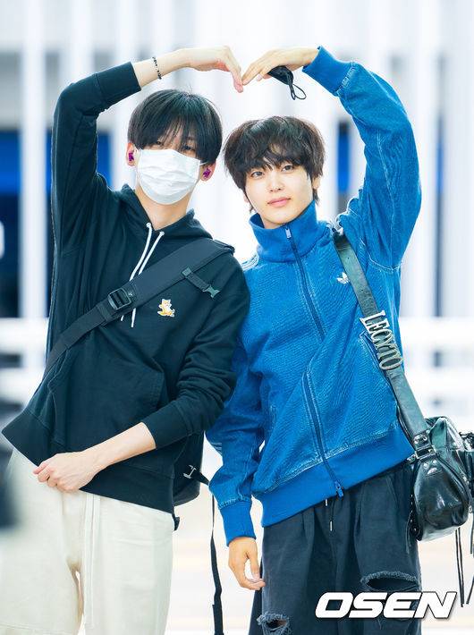크래비티 정모와 형준이 출국길에 포즈를 취하고 있다. 2025.09.12 / rumi@osen.co.kr