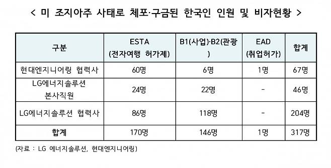 더불어민주당 정책위원회 의장인 한정애 의원(서울 강서병)이 12일 외교부 등으로부터 확보한 자료에 따르면 미국 조지아 공장에서 체포된 회사별 한국인 직원 수는 현대엔지니어링과 LG에너지솔루션 각각 67명, 250명에 달했다. LG에너지솔루션 본사 직원 46명을 제외하면 모두 협력사 소속이었다. 총 317명 중 절반 이상(53%)인 170명이 ESTA를 소지한 채로 입국했다.