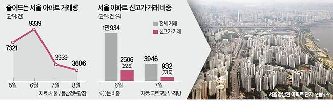 12일 서울부동산정보광장에 따르면 강남구 아파트 거래량은 지난 7월 313건에서 8월 80건으로 74.4% 급감했다. 서초구도 같은 기간 195건에서 70건으로 64.1% 줄었다. 잇따른 대출 규제 등에 거래가 대폭 감소한 것으로 분석된다. 정부는 지난 6월 ‘가계부채 관리 방안’에 이어 9·7 부동산 대책을 통해 규제지역(강남 3구·용산구)에서 무주택자와 처분조건부 1주택자의 담보인정비율(LTV)을 기존 50%에서 40%로 강화했다. 강남구 신사동 B공인 관계자는 “대출 규제 강화로 거래가 잘 이뤄지지 않는다”며 “다량의 현금을 확보한 사람만 강남 아파트를 살 수 있는 구조가 고착화하는 것 같다”고 말했다.