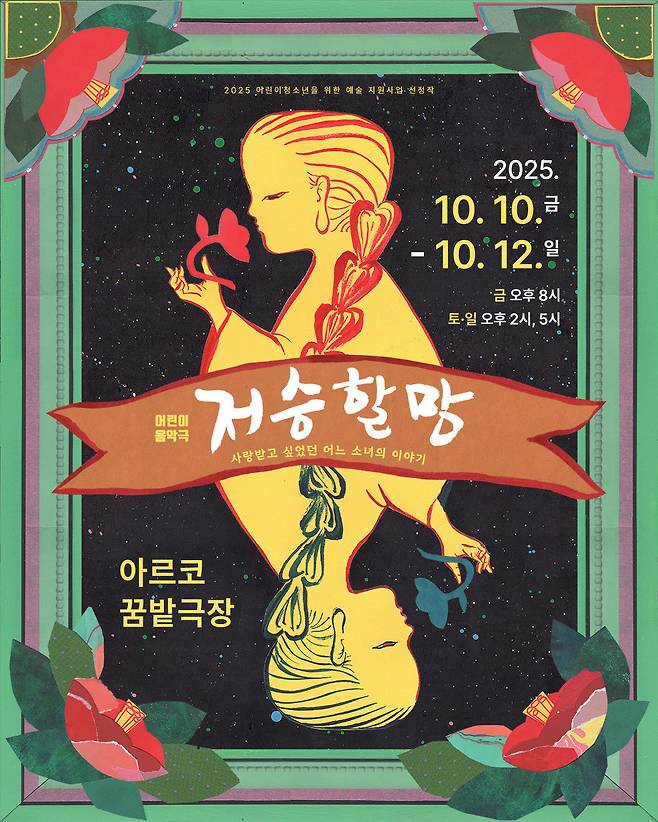 '저승할망'은 2025년 어린이·청소년을 위한 예술지원사업 선정작으로, 한국문화예술위원회와 아르코 꿈밭극장이 후원한다.