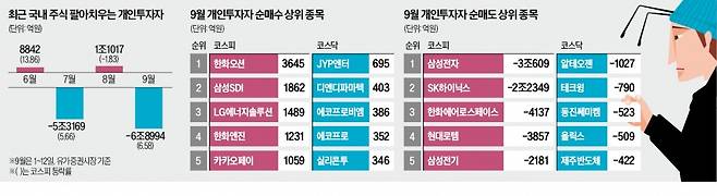 개인은 최근 상승장을 주도한 반도체 업종을 집중적으로 팔아치우고 있다. 9월 들어 가장 많이 순매도한 종목은 삼성전자와 SK하이닉스였다. 순매도 규모가 각각 3조609억원, 2조2349억원에 달한다. 두 종목 주가는 해당 기간 22.12%, 8.18% 올랐다.