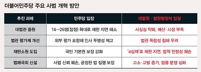 재경지법의 B 부장판사는 "올 것이 왔다는 생각"이라며 "(민주당이) 검찰 개혁 다음은 사법 개혁이라고 말해 오지 않았느냐"고 한탄했다. 대선 전부터 조 대법원장의 선거 개입을 강하게 질타하며 사법 개혁을 언급해온 만큼 대법원을 압박하기 위한 예견된 수순이라는 인식이다. 실제 민주당 사법개혁특별위원회(사개특위)가 준비 중인 5대 입법안 가운데 가장 우선 논의되고 있는 것이 현재 14명인 대법관을 2029년까지 26명으로 증원하겠다는 것이다.