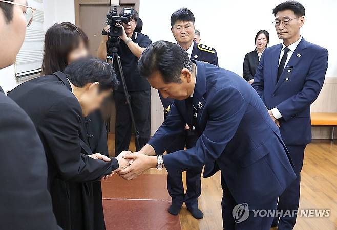 (인천=연합뉴스) 임순석 기자 = 더불어민주당 정청래 대표가 12일 인천 동구의 한 장례식장에 마련된 해양경찰관 고(故) 이재석 경사 빈소를 찾아 조문한 뒤 유가족을 위로하고 있다.