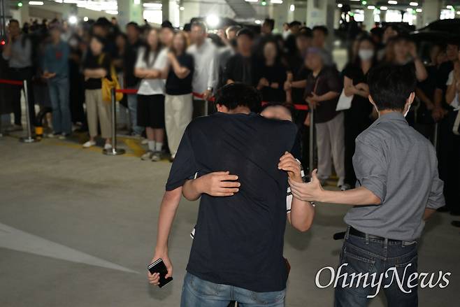 마지막 남은 노부부가 아들을 만날 때까지 엘리베이터는 수십 번 열리고 닫혔다. 한 번 열릴 때마다 대여섯명의 노동자들이 나왔다. 대부분 마스크를 썼고, 간소한 짐을 들고 있었다. 남매는 아빠를, 노부부는 아들을, 협력사 대표는 직원들을 다시 만났다. 이들을 애타게 기다리던 가족들은 이름을 크게 부르며 서로 눈을 맞췄고, 포옹하거나 손을 꼭 잡았다. 안도감, 기쁨으로 울음과 웃음소리가 가득했던 재회는 오후 4시께부터 시작돼 30여분간 이어졌다.