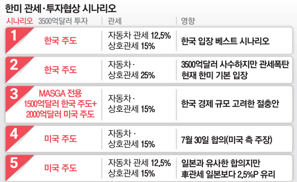 3500억달러 대미투자펀드를 놓고 한국은 융자와 보증까지 묶어 구성할 계획인데 미국은 전액 현금으로 조달할 것을 요구하면서 협상이 교착 상태에 빠졌다. 협상의 판이 깨지면 한국은 모든 품목에 대해 대미 관세 25%를 수용해야 한다.
