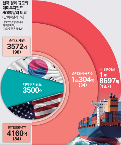 12일 통상 및 금융당국에 따르면 3500억달러는 한국 외환보유액(8월 말 현재 4163억달러)의 84%에 달한다. 현실적으로 현금 조달이 불가능한 대목이다.