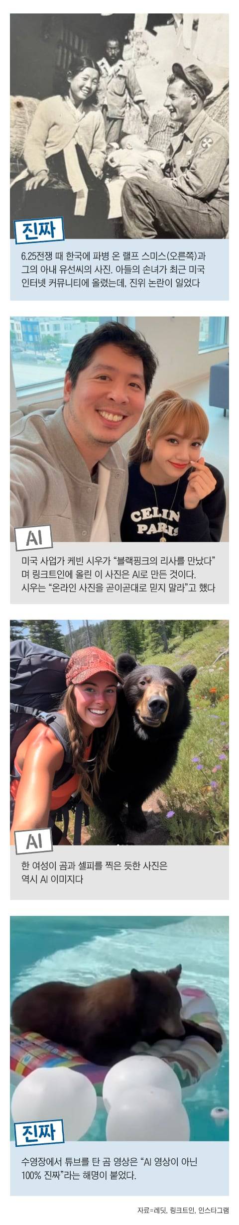 지난 6일 2030 여성들이 주로 이용하는 한 온라인 커뮤니티에 ‘충격적인 이 사진들의 공통점’이란 글이 올라왔다. 총 71장의 아름다운 풍경 사진이 담긴 글 말미에는 “전부 우리나라, 한국”이라고 적혀 있었다. 게시물은 조회 수 11만회를 넘기며 큰 화제를 모았는데, 댓글에는 AI 사진인 줄 의심했다는 고백이 여럿 달렸다. “‘AI겠지, 뭐’라며 스크롤을 내렸다” “AI 합성인가 했는데, 우리나라라고?” 등이었다. 지난달 인스타그램에 올라온 곰 영상도 비슷한 반응이었다. 미국의 한 가정집 수영장에 곰이 뛰어들어 컵 케이크 모양 튜브를 타고 물놀이를 즐기는 영상이었는데, 글쓴이는 “여러분은 AI 곰이 트램펄린에서 뛰는 영상을 보셨겠지만, 이건 100% 진짜”라고 소개했다. 한 인스타그램 이용자는 “AI 영상인 줄 알고 대충 봤다가 다시 제대로 봤다”는 댓글을 달았다.
