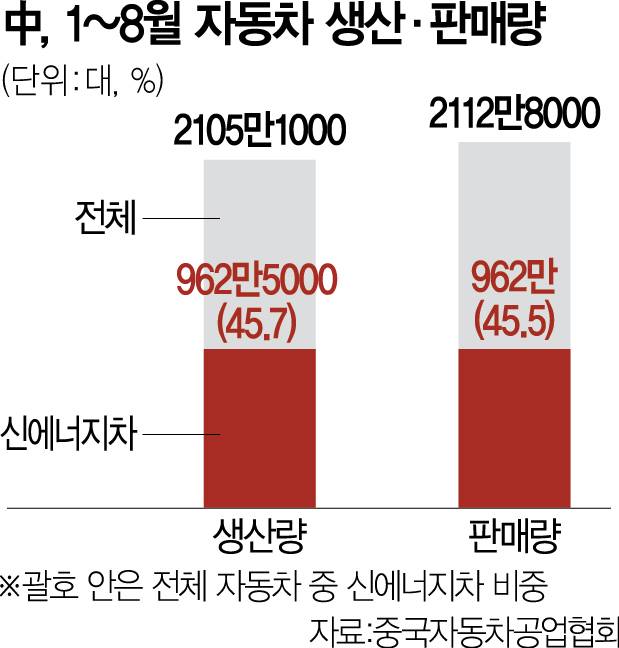 12일 중국 경제 매체 차이신에 따르면 중국자동차공업협회가 발표한 1~8월 신에너지차(전기차와 플러그인하이브리드 포함) 판매량이 전년 동기 대비 36.7% 증가한 962만 대로 집계됐습니다. 전체 신차 판매의 45.5%를 차지했는데요. 중국 내 신에너지차 판매량은 800만 대로 전체 판매량의 48%였으며 지금 추세가 이어지면 연말까지 50%의 점유율을 달성할 가능성이 높게 점쳐집니다. 8월 중국 내 자동차 생산량과 판매량은 각각 281만 5000대와 285만 7000대로 전년 동기 대비 13%, 16.4%씩 증가했습니다. 8월 신에너지차 생산량과 판매량은 각각 139만 1000대와 139만 5000대로 전년 동기 대비 27.4%, 26.8% 늘었습니다. 신에너지차 판매량이 전체 신차 판매량의 48.8%로 절반에 육박하는 셈입니다. 2020년 중국 정부가 2025년까지 신에너지차의 신차 판매 비중을 20%까지 끌어올리겠다고 밝혔지만 업체 간 경쟁이 치열해지면서 정부 목표를 일찌감치 초과 달성하게 됐습니다.