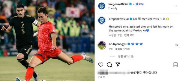 헹크는 멕시코전 이후 SNS에 오현규의 사진을 게시한 뒤 "오현규 1-0 메디컬 테스트"라고 덧붙였다.