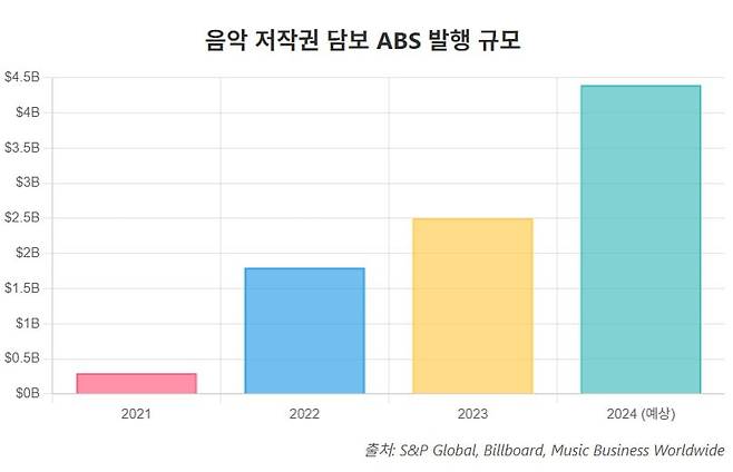 영국 파이낸셜타임스(FT)에 따르면 음악 저작권 담보 부채 발행 규모는 2021년 약 3억 달러에서 지난해 33억 달러 이상으로 급증했다. 올해는 44억 달러로 사상 최대치를 경신할 전망이다.