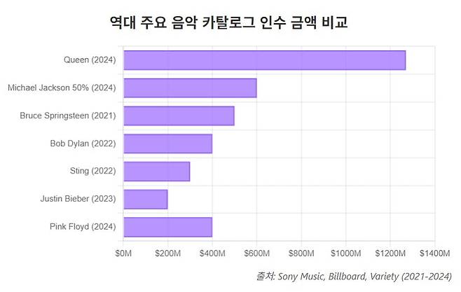 월가 자본의 유입은 시대를 초월한 음원의 저작권 가치를 끌어올리기도 했다. 소니 뮤직 그룹은 지난해 2월 마이클 잭슨 재단이 보유한 음악 카탈로그(음반 마스터 권리 및 퍼블리싱 등 ) 지분의 50%를 6억 달러 이상에 인수하는 계약을 체결했다. 마이클 잭슨의 전체 카탈로그 가치를 최소 12억달러에서 최대 15억 달러로 평가한 것이다. 역대 단일 아티스트 자산에 대해 최대 평가액이다. 소니 뮤직은 작년 6월엔 록 밴드 퀸의 음악 카탈로그를 약 12.7억달러에 인수하는 데 합의했다. 이 거래는 음반과 퍼블리싱 권리뿐만 아니라 밴드의 이름, 이미지, 초상권까지 포함하는 포괄적인 계약이다.