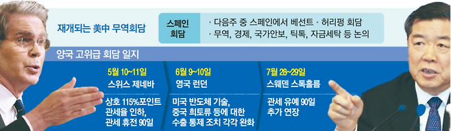 두 사람의 회담은 트럼프 대통령의 ‘관세 폭탄’으로 촉발된 양국 무역 전쟁이 발발한 이후 4번째로 열리는 고위급 무역 회담이다. 지난 4월 상호 보복전 속에 앞다퉈 관세율을 올리던 양국은 5월 스위스 제네바에서 열린 제1차 고위급 회담을 계기로 각각 115% 포인트씩 관세율을 대폭 낮추기로 합의했다. 당시 양측은 추가 관세율 115% 가운데 91%포인트는 취소하고 24%포인트에 대해선 적용을 90일 유예했다.