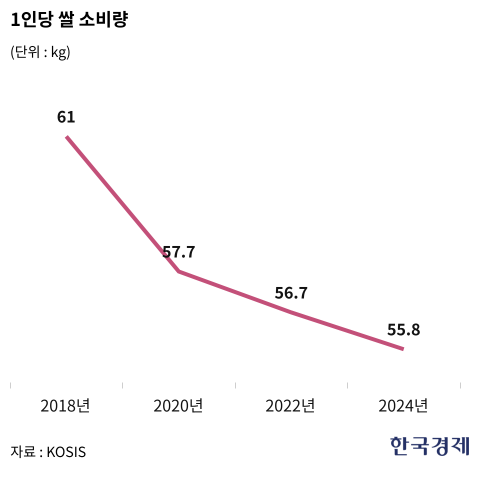 통계청이 발표한 ‘양곡 소비량 조사’에 따르면 1인당 쌀 소비량은 2019년 60㎏선이 깨진 59.2%를 기록한 이후 지난해 55.8㎏까지 떨어졌다. 밥솥 생산을 전담하는 쿠쿠전자의 올 상반기 매출도 3950억원으로 전년 동기 대비 1.1배로 늘어나는 데 그쳤다.