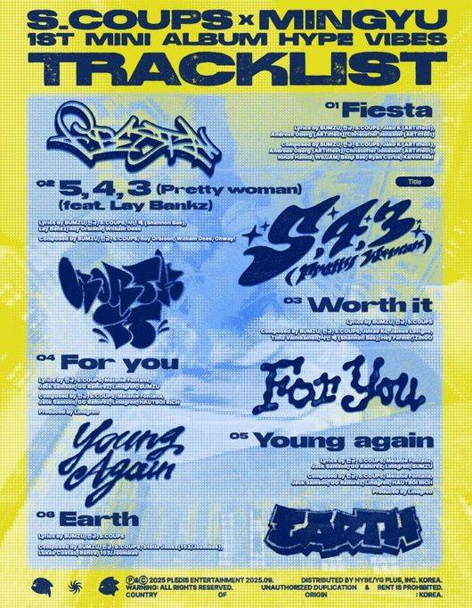하이브(의장 방시혁) 뮤직그룹의 레이블 플레디스 엔터테인먼트는 지난 12일 오후 10시에 세븐틴의 공식 SNS에 에스쿱스X민규 미니 1집 ‘HYPE VIBES’의 트랙리스트를 게재했다. 이에 따르면 신보에는 타이틀곡 ‘5, 4, 3 (Pretty woman) (feat. Lay Bankz)’를 포함해 ‘Fiesta’, ‘Worth it’, ‘For you’, ‘Young again’, ‘Earth’ 총 6곡이 실린다.