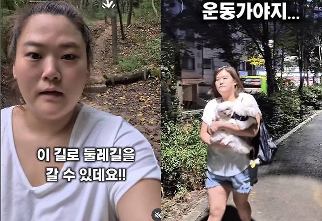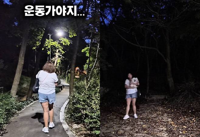 영상 속 수지 씨는 늦은 밤, 반려견을 품에 안고 둘레길로 운동을 하러 가는 모습. 하지만 이내 수지 씨는 어두운 산책로에 무서워하며 급하게 다시 돌아 나왔다.