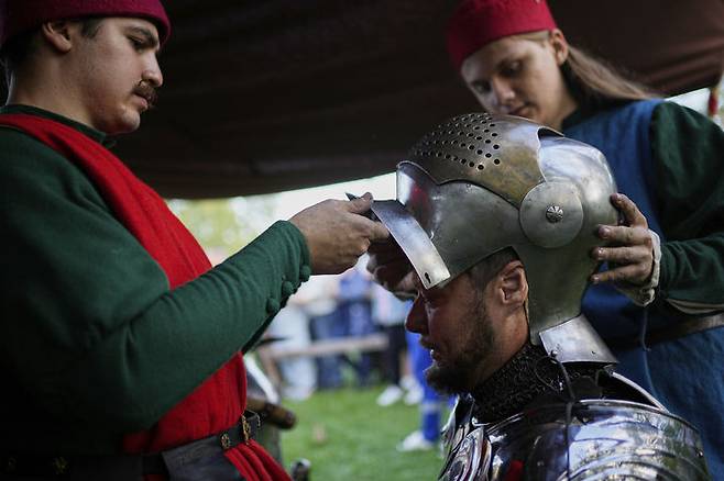 [모스크바=AP/뉴시스] 12일(현지 시간) 러시아 모스크바 차리치노 공원에서 열린 중세 기사들의 결투를 재현하는 '세인트 조지 토너먼트'에서 중세 갑옷을 입은 참가자가 투구를 착용하고 있다. 2025.09.13.