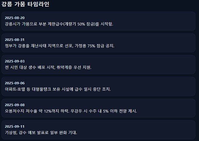 이 대통령은 “지난 7월 6일부터 시작된 가뭄의 여파가 이번 비로 해소되진 않겠지만, 무기한 제한 급수 조치로 빨래나 샤워조차 마음 놓고 할 수 없을 정도로 고통받고 계신 강릉 시민들에게 조금이나마 위안이 되길 바란다”며 “정부는 지난 8월 30일 현장을 직접 방문해 실태를 점검하고, 국가 재난 사태 선포를 결정한 이래 국가 소방동원령까지 발령하며 긴급 대응에 나섰다”고 설명했다.