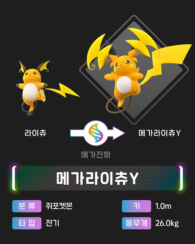 메가라이츄Y: 뛰어난 순발력을 가졌으며, 전신을 돌며 수 배 이상 증폭된 전격을 날린다. 순발력이 강점으로 단기 결전에 특화되어 있습니다. 뺨에 있는 전기 주머니의 발전량이 증가하였으며,
