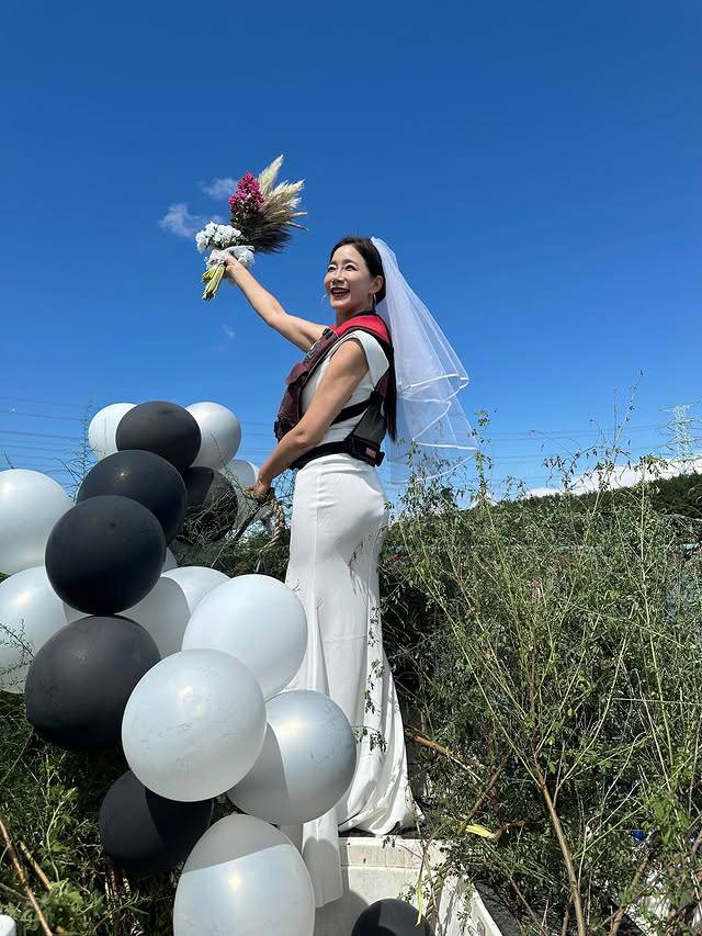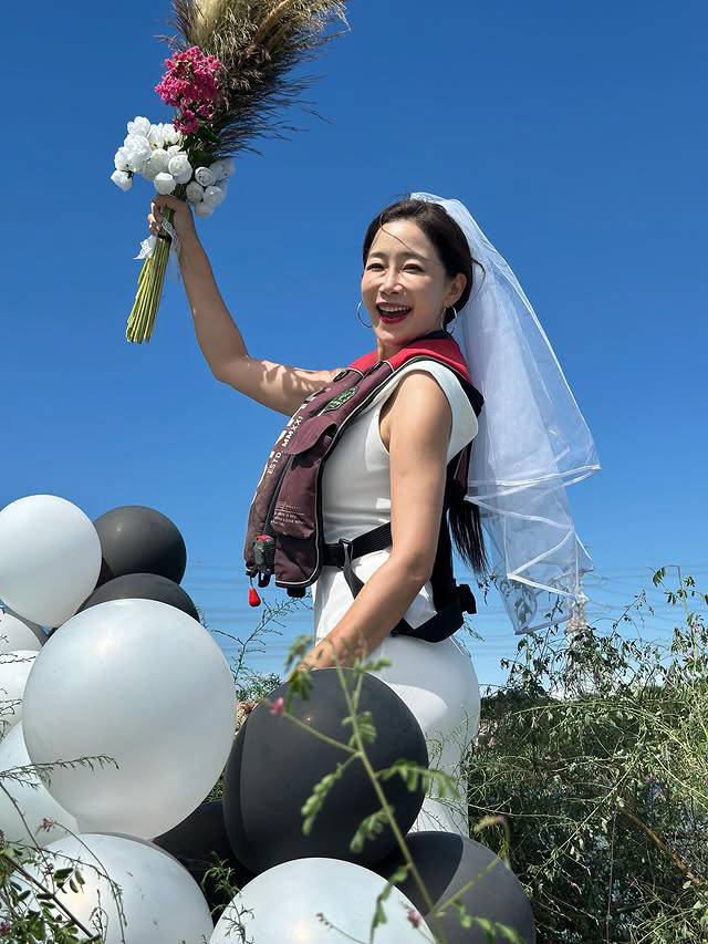 사진 속 김하영은 웨딩드레스에 구명조끼를 입은 독특한 신부의 모습으로 시선을 모은다.