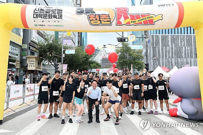 (서울=연합뉴스) 이성헌 서울 서대문구청장(앞줄 오른쪽 두 번째)이 13일 서울 서대문구 신촌 연세로에서 열린 '2025 신촌 글로벌 대학문화축제'의 '5K 청춘 RUN'에서 참가자들과 함께 기념촬영하고 있다. 2025.9.13 [서대문구 제공. 재판매 및 DB 금지]