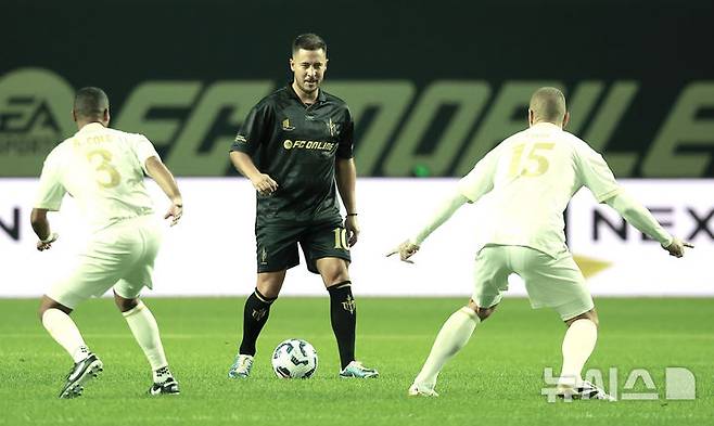 [서울=뉴시스] 정병혁 기자 = 13일 서울 마포구 서울월드컵경기장에서 열린 2025 넥슨 아이콘매치 이벤트매치 3대3 대결에서 아자르가 돌파하고 있다. 2025.09.13. jhope@newsis.com