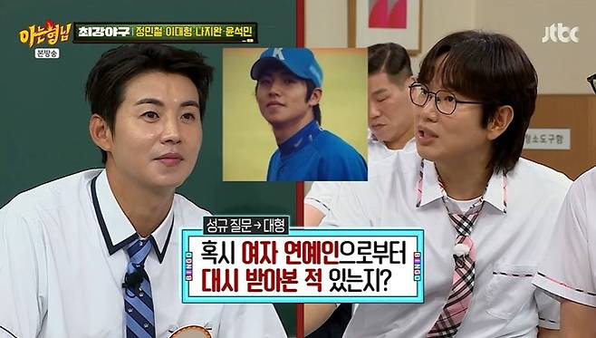 이어 장성규는 이대형에게 "정말 잘생겼는데, 여자 연예인 대시 받아본 적 있냐"라고 물었지만, 이대형은 "솔직하게 그런 적 없다"고 답했다. 정민철이 약간 머뭇거렸다고 의심하자 이대형은 "우리가 선수할 때까지는 SNS가 발달을 안 해서 만남의 기회가 없었다. 내가 나이트를 많이 가는 선수도 아니라서 만남의 장이 많이 없었다"고 밝혔다. 이수근이 "네가 대시한 사람 2명만 얘기해 봐라"고 몰아갔지만, 이대형은 "난 그런 건 전혀 없었다"고 넘어가지 않았다.