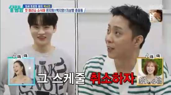 은지원은 상황을 가만히 지켜보더니 박서진을 향해 "그 스케줄 취소하자"고 말해 웃음을 자아냈다.