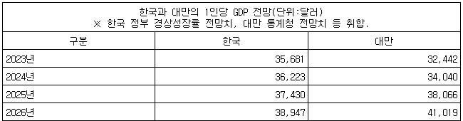이는 우리 정부가 지난달 22일 제시한 올해 명목 GDP 성장률 전망치와 대만 통계청이 이달 10일 제시한 올해 1인당 GDP 전망치를 토대로 단순 비교한 것이다.