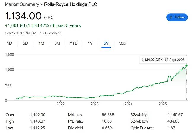 영국 런던증권거래소에 상장된 롤스로이스는 지난 2023년 이후 주가가 10배 이상 올랐습니다. 2022년 12월 30일 종가는 1파운드가 채 안 되는 0.93파운드에 마감했습니다. 현재 주가는 지난 12일 11.34파운드에 마감했습니다.