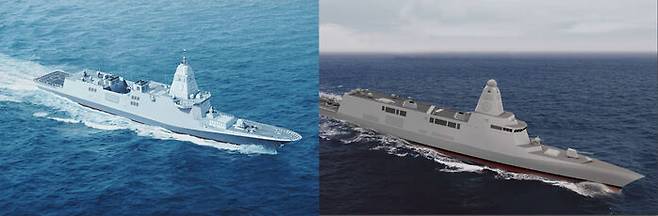 ▲ HD현대중공업의 KDDX 이미지(왼쪽)와 한화오션의 KDDX 이미지