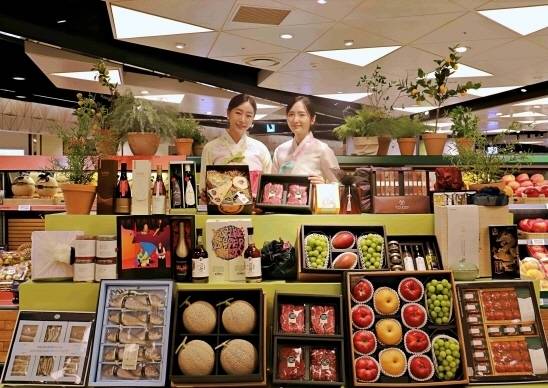 [서울시 송파구 잠실동에 위치한 롯데백화점 잠실점 지하 1층 식품관에서 모델들이 추석 선물 세트를 홍보하고 있다. (롯데백화점 제공=연합뉴스)]