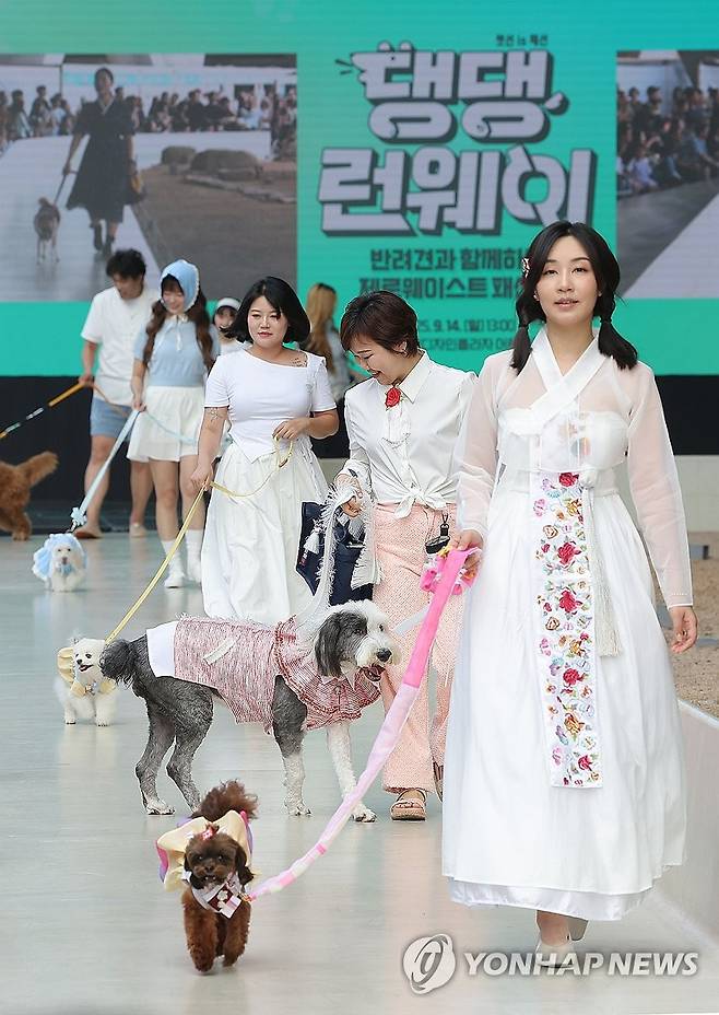 (서울=연합뉴스) 류영석 기자 = 14일 서울 중구 동대문디자인플라자(DDP)에서 열린 반려견과 함께하는 제로웨이스트 패션쇼 "댕댕런웨이"에서 참가 시민과 반려견이 런웨이를 걷고 있다. 2025.9.14
