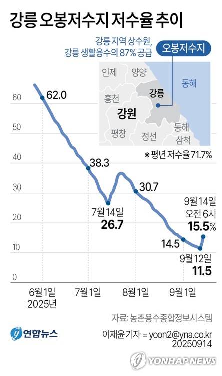 (서울=연합뉴스) 이재윤 기자 = 극심한 가뭄을 겪는 강릉지역의 생활용수 87%를 공급하고 있는 오봉저수지의 저수율은 오전 6시 기준 15.5%로(평년 71.7%) 전날보다 2.5%포인트 상승했다.