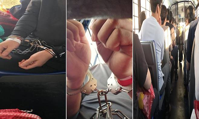| 수갑에 쇠사슬까지 채우고 연행 지난 4일(현지시간) 미국 조지아주 배터리 공장 건설 현장에서 일하다 미국 이민세관단속국(ICE)에 의해 체포된 근로자들이 수갑과 쇠사슬을 찬 채 연행되고 있다. 7일간 구금됐다가 석방된 근로자들 중 한 명이 ‘구금일지’와 함께 위 사진을 공개한 가운데, ICE가 체포 목표 인원 200명을 채우려고 B-1 비자 소지자까지 체포했다는 증언이 나왔다. 연합뉴스 |