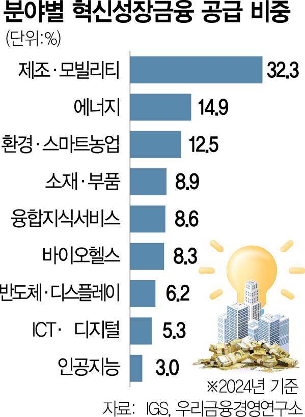지난해 정책금융기관과 KB국민·우리은행 등 민간이 공급한 혁신성장금융 135조 원 가운데 인공지능(AI) 분야가 차지한 비중이 3%에 불과한 것으로 나타났다.