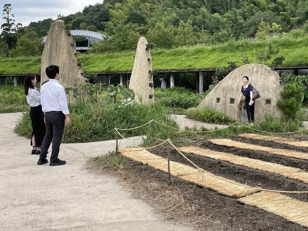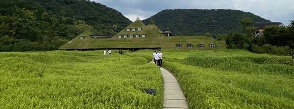 주차장에서 건물로 가는 둘레 공간에는 키가 낮은 대나무로 사시사철 푸른 색을 즐길 수 있습니다. 둥근 원형 안에 벼농사를 짓는 논을 배치하고 논 바깥쪽에는 밭을 배치하여 토란, 부추, 생강, 오크라, 가지, 배추 들 여러 가지 푸성귀를 키웁니다. 논과 밭 바깥쪽에는 건물을 짓고, 안에서는 케이크나 과자를 만드는 모습을 보면서 그것을 직접 사서 먹을 수 있습니다.