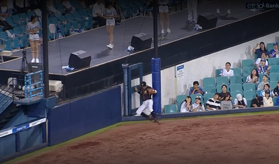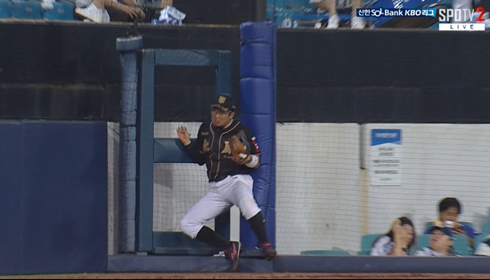 KT 마무리 박영현이 선두타자 김성윤 상대 2스트라이크 카운트에서 좌측 파울지역 높게 뜬 타구를 유도했다. 3루수 허경민이 김성윤의 타구를 쫓아가 살짝 점프하며 공을 잡았는데, 착지하는 과정에서 그라운드 바깥 익사이팅석과 연결되는 문에 몸을 부딪쳤다.