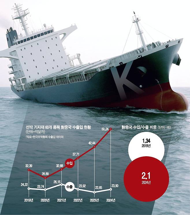 14일 한국무역협회 수출입 데이터에 따르면 선박 평형수 처리 설비, 펌프, 기계, 밸브류 등 선박 기자재 60개 품목의 대중 무역적자는 2019년 8억1700만달러에서 2024년 26억3400만달러로 약 18억달러(2조5000억원) 증가한 것으로 나타났다. 같은 기간 수출 대비 수입 비율은 1.34배에서 2.1배로 악화됐다.
