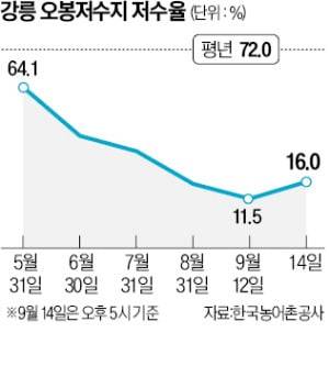 농촌용수종합정보시스템에 따르면 14일 오후 5시 기준 오봉저수지 저수율은 16%로 집계됐다.
